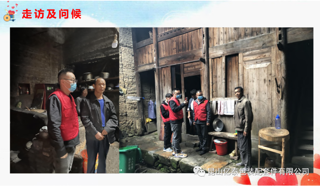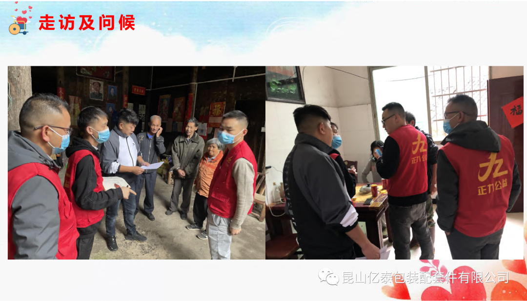 此次活动中,亿泰的徐总与志愿者们不顾山路难行,全程不停歇地走访了18户独居老人和残疾人的家,陪同老人聊天,了解老人的生活及家庭情况,并帮助老人做力所能及的家务,离开时还为每一户人家送上了大米,粮油、牛奶、棉被子、枕头、四件套等日用生活品,并送上了慰问金。