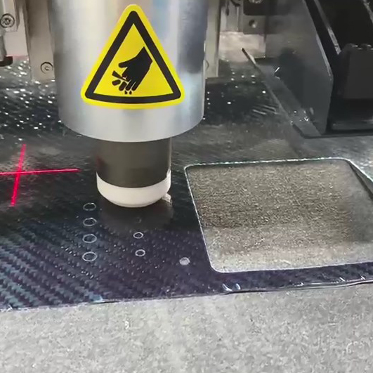 碳纤维编织布种类繁多(如单向布、缎纹布、平纹布等),其韧性极强,人工切割效率低且易散边-。而激光切割会产生灼烧,改变材料特性-。振动刀切割机通过超高频振动刀头(频率达16000-18000rpm),实现“冷切割”-: